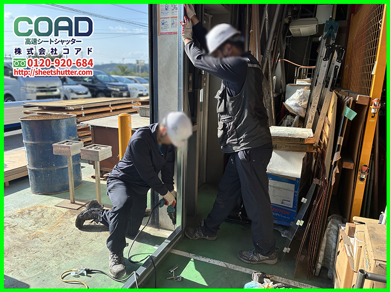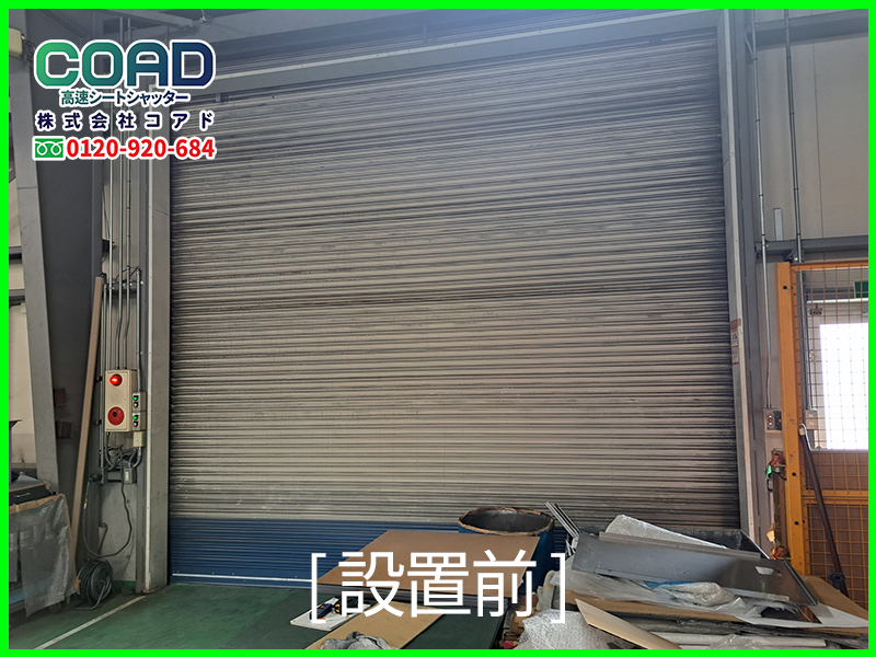 もともと出入口が2ヶ所あり、そのうち1ヶ所にはすでに他社製のシートシャッターが設置されていましたが、もう一方の出入口は防犯シャッターのみ。